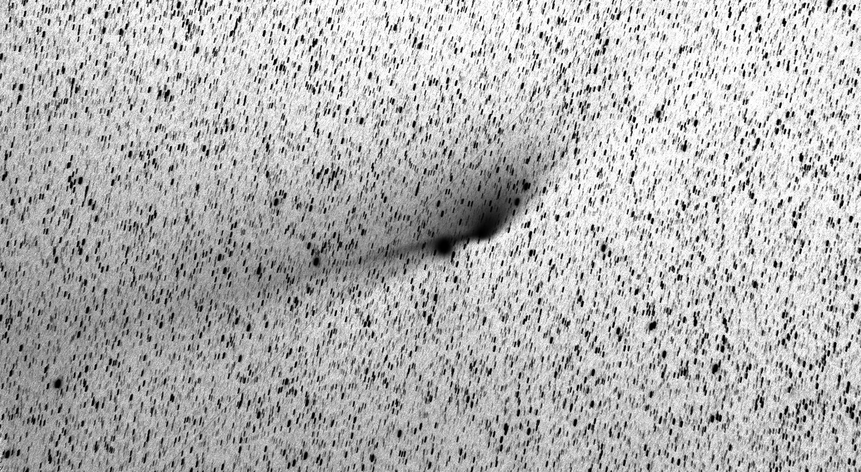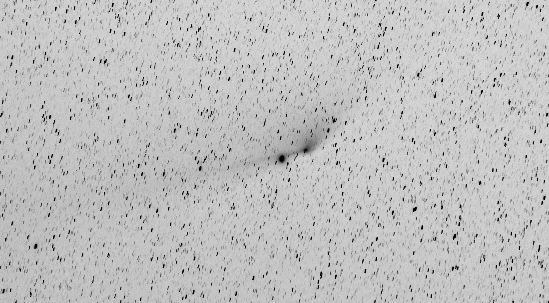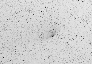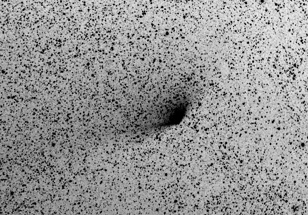 Traitement de 25 poses RAW (15x60s ISO 6400 + 10x120s ISO 3200) avec corrections de vignettage avec Nebulosity 3. Compositage négatif N&B avec Photoshop en recentrant sur le noyau de la comète, ce qui fait que les étoiles apparaissent trainées (première pose vers 23h, la dernière vers 23h43).