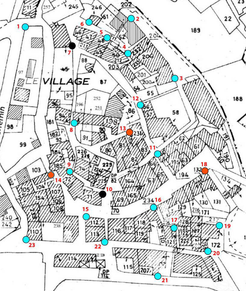 Catalogue de l'éclairage à Vachères : le VillageCliquez sur l'un des repères pour voir les photos jour/nuit du lampadaire numéroté.Les symboles bleus indiquent les lumières au Vapeur de Mercure. Les symboles rouges celles au Sodium Haute Pression. Les deux symboles noirs indiquent les lampadaires actuellement éteints.
